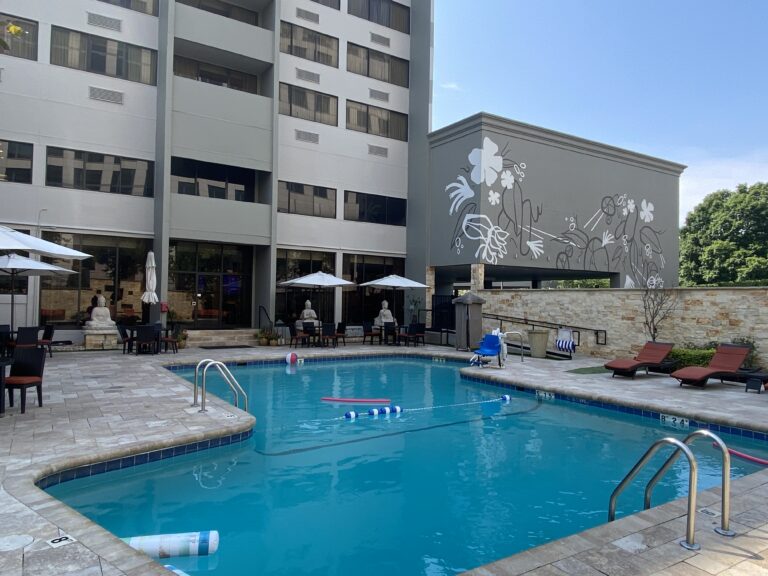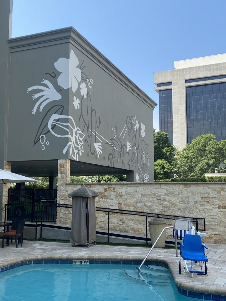 This mural continues the hotel’s color palette and showcases native flora, creating a warm, welcoming garage entrance and view from the pool for guests, visitors, and staff alike.