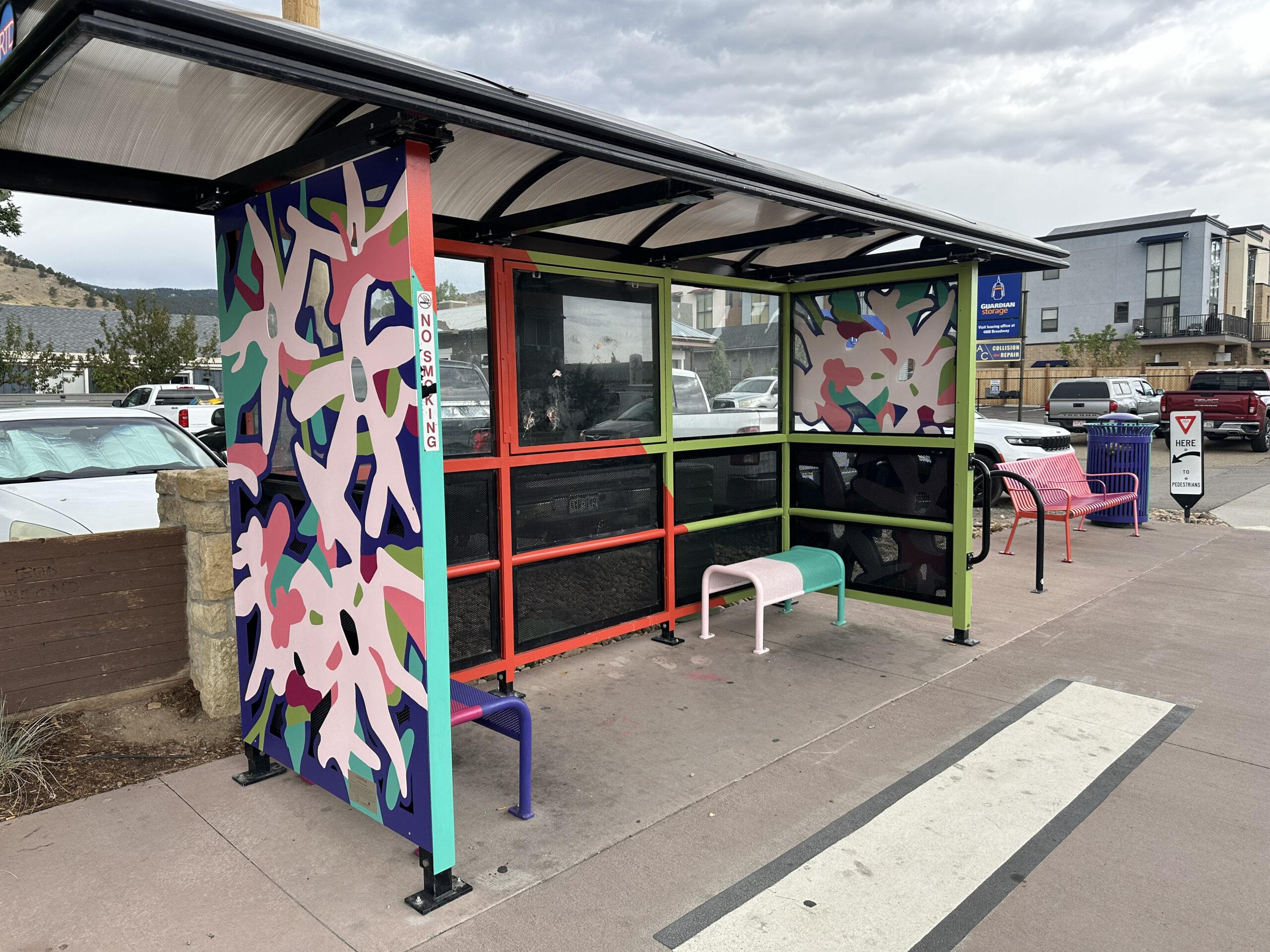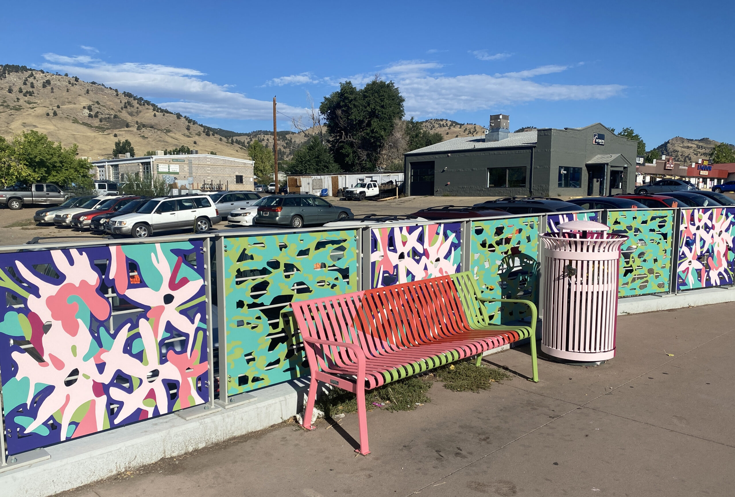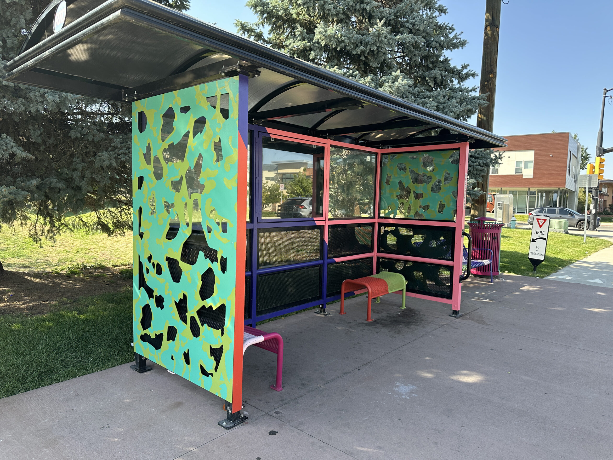 This transit public art includes painted panels on a bridge, 2 bus shelters, a bus top railing, 6 benches and 6 trash cans. Unfolding celebrates the creative evolution of the NoBo Arts district through vibrant color and native flora and fauna (abstracted marble butterfly wings and showy milkweed). The relationship between artists and society is symbiotic and sustaining—each nourishes the other, as milkweed does the butterfly.