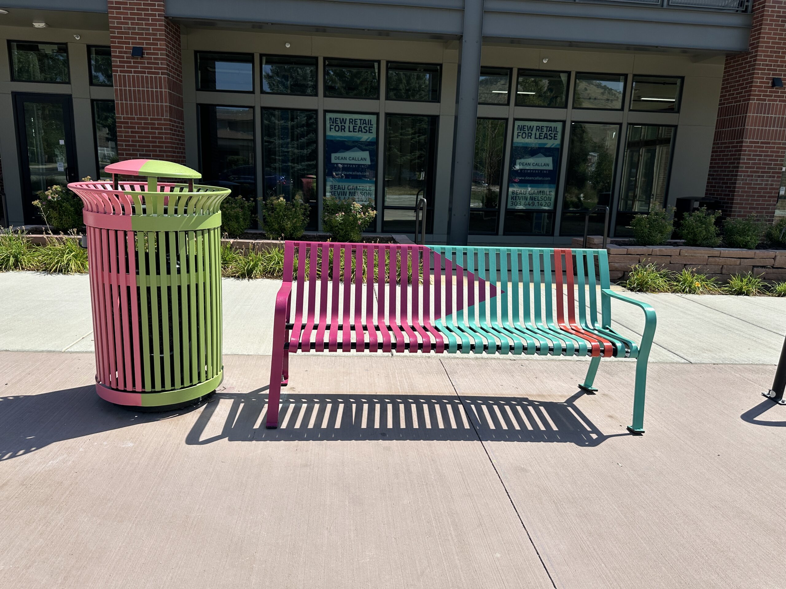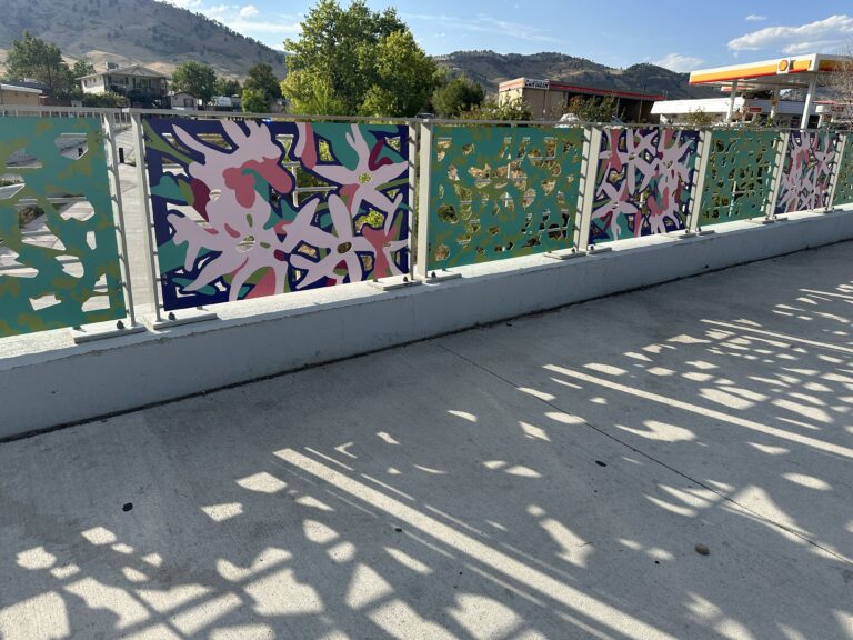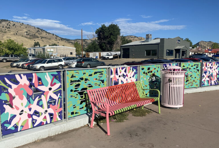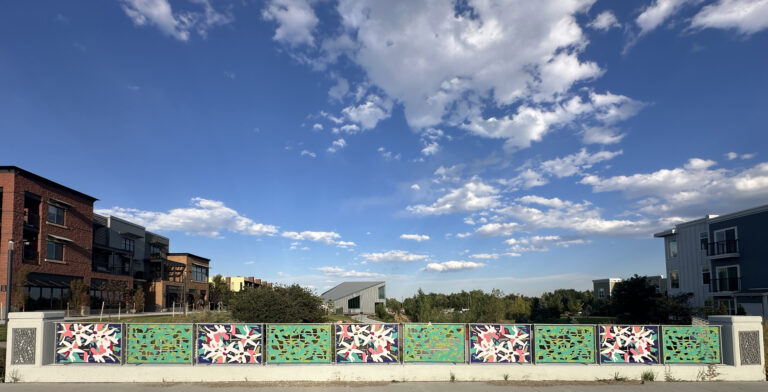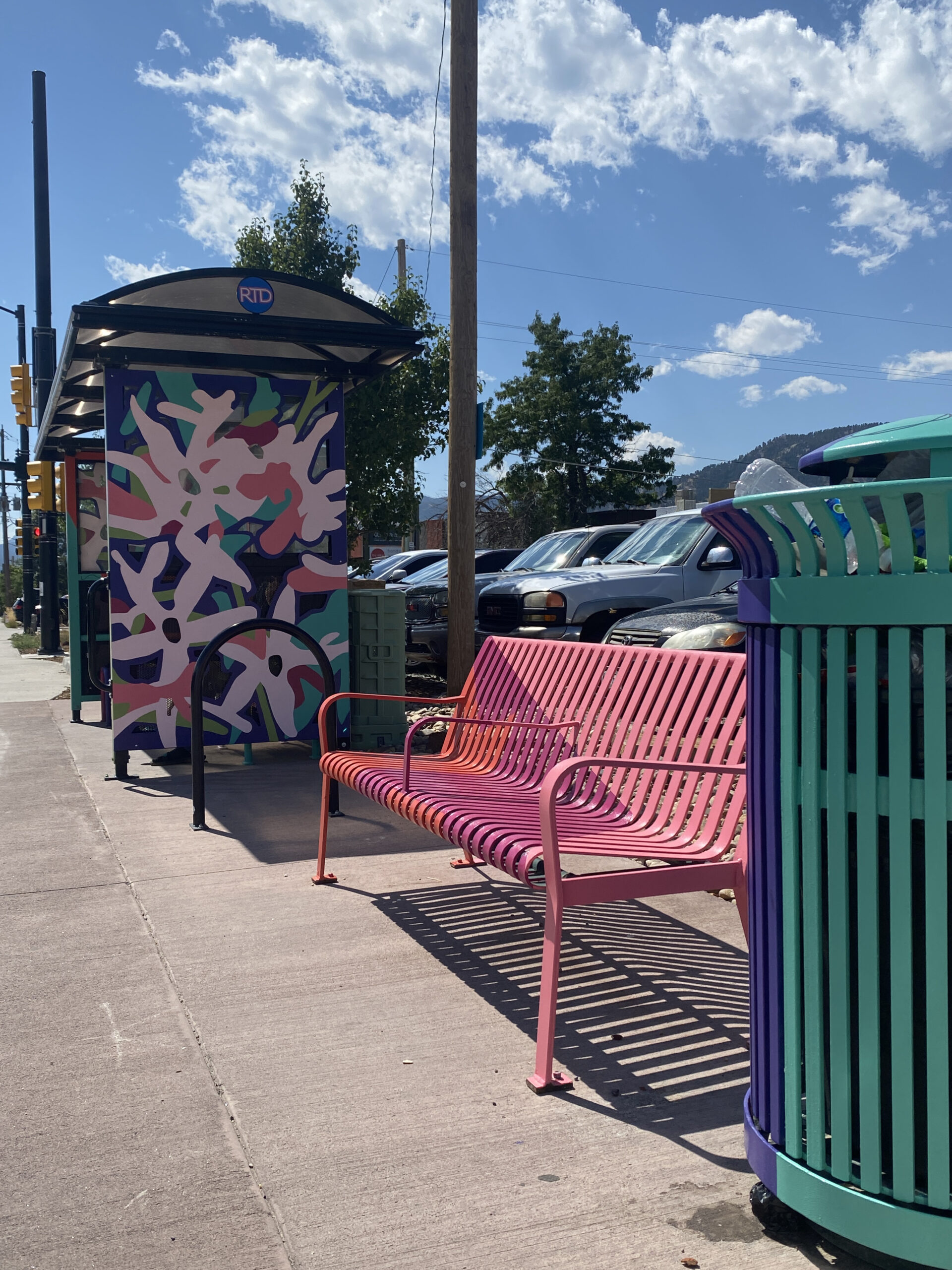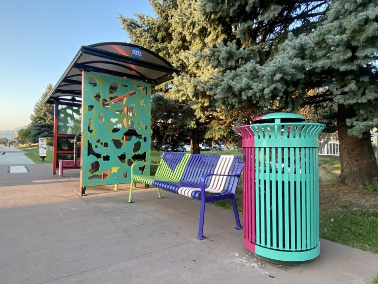 This transit public art includes painted panels on a bridge, 2 bus shelters, a bus top railing, 6 benches and 6 trash cans. Unfolding celebrates the creative evolution of the NoBo Arts district through vibrant color and native flora and fauna (abstracted marble butterfly wings and showy milkweed). The relationship between artists and society is symbiotic and sustaining—each nourishes the other, as milkweed does the butterfly.